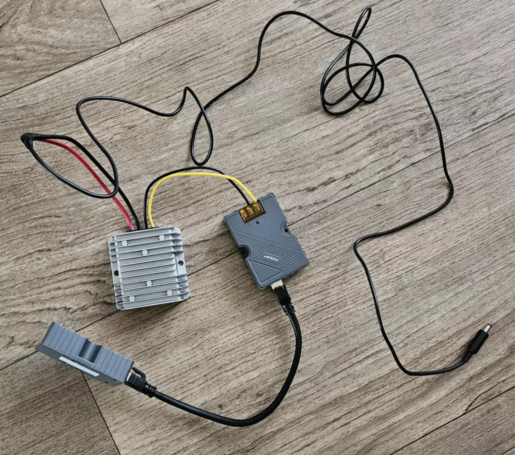 – 12V converter kitje voor Starlink. Deze zet 12V om naar 48V PoE voor de voeding van de Starlink.