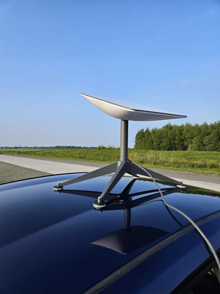 De Starlink op het dak van mijn auto. Magneetjes aan de voet gemaakt en wat vilt zodat mijn dak niet beschadigd.